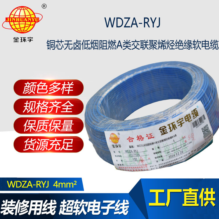 WDZA-RYJ低煙無鹵阻燃電線具有高阻燃、耐高溫、低煙低毒的良好性能,適用于額定電壓450/750V及以下耐熱105℃或125℃固定布線和電力、電子設備內部連接線,如家庭裝修、消防設備、緊急電源插座等供電。
