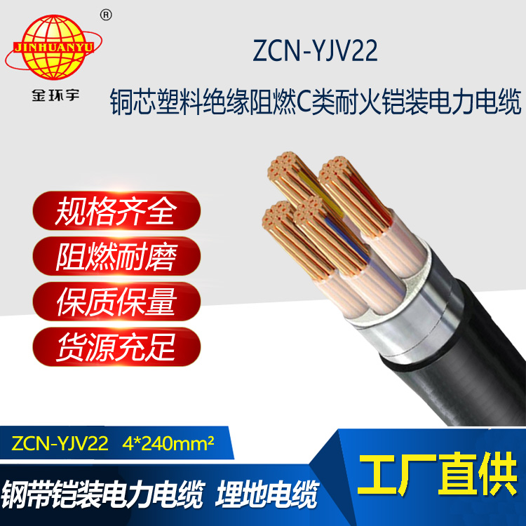 ZCN-YJV22電纜:銅導體C級阻燃耐火交聯聚乙烯絕緣聚氯乙烯內護層鋼帶鎧裝聚氯乙烯外護套 力電纜。C級阻燃(ZC)、耐火(N)電力電纜、交聯聚乙烯絕緣(YJ)、聚氯乙烯護套(V)、鋼帶鎧裝(22)